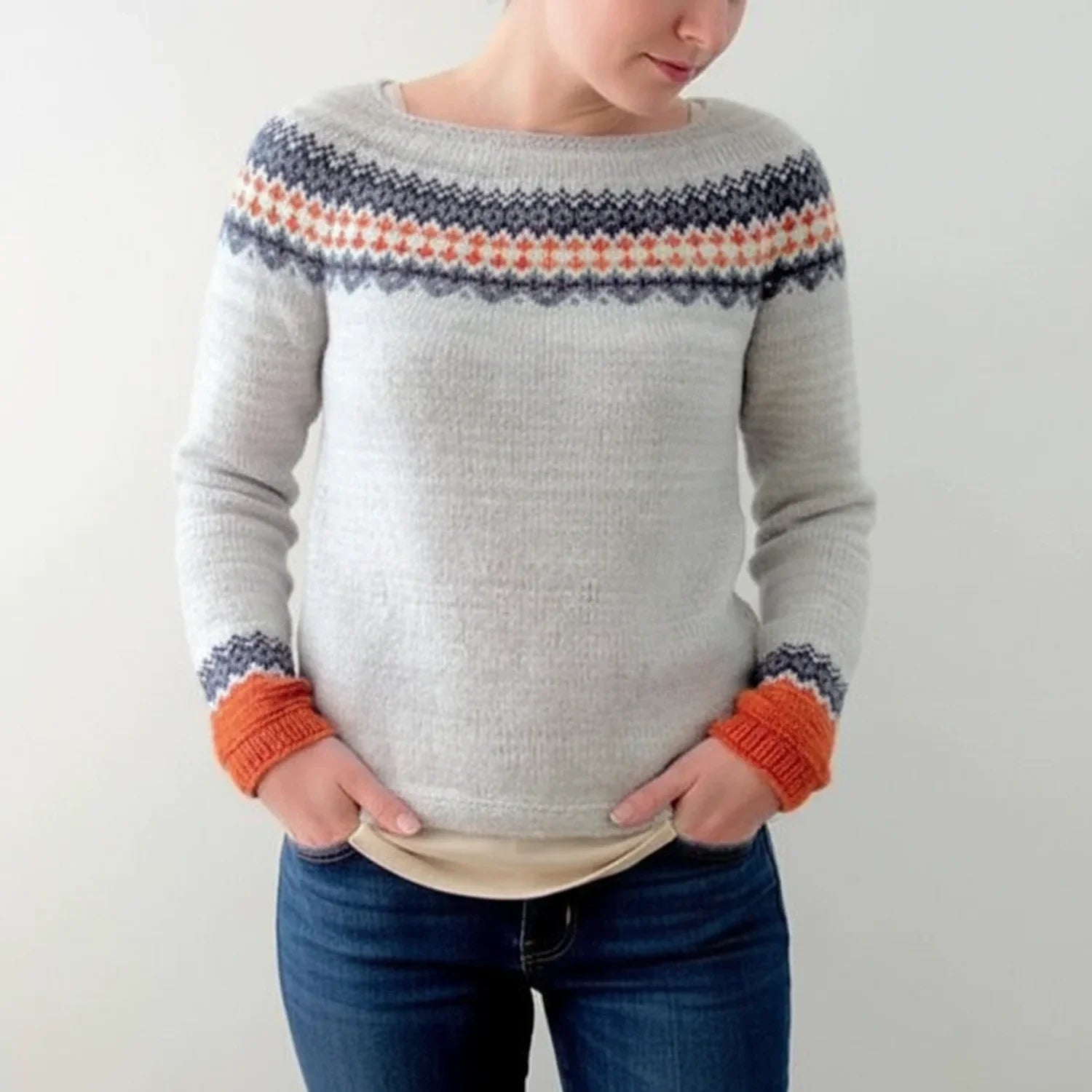 Cozy Fair Isle Cable Knit Sweater for Women | Classic Crew Neck Pullover